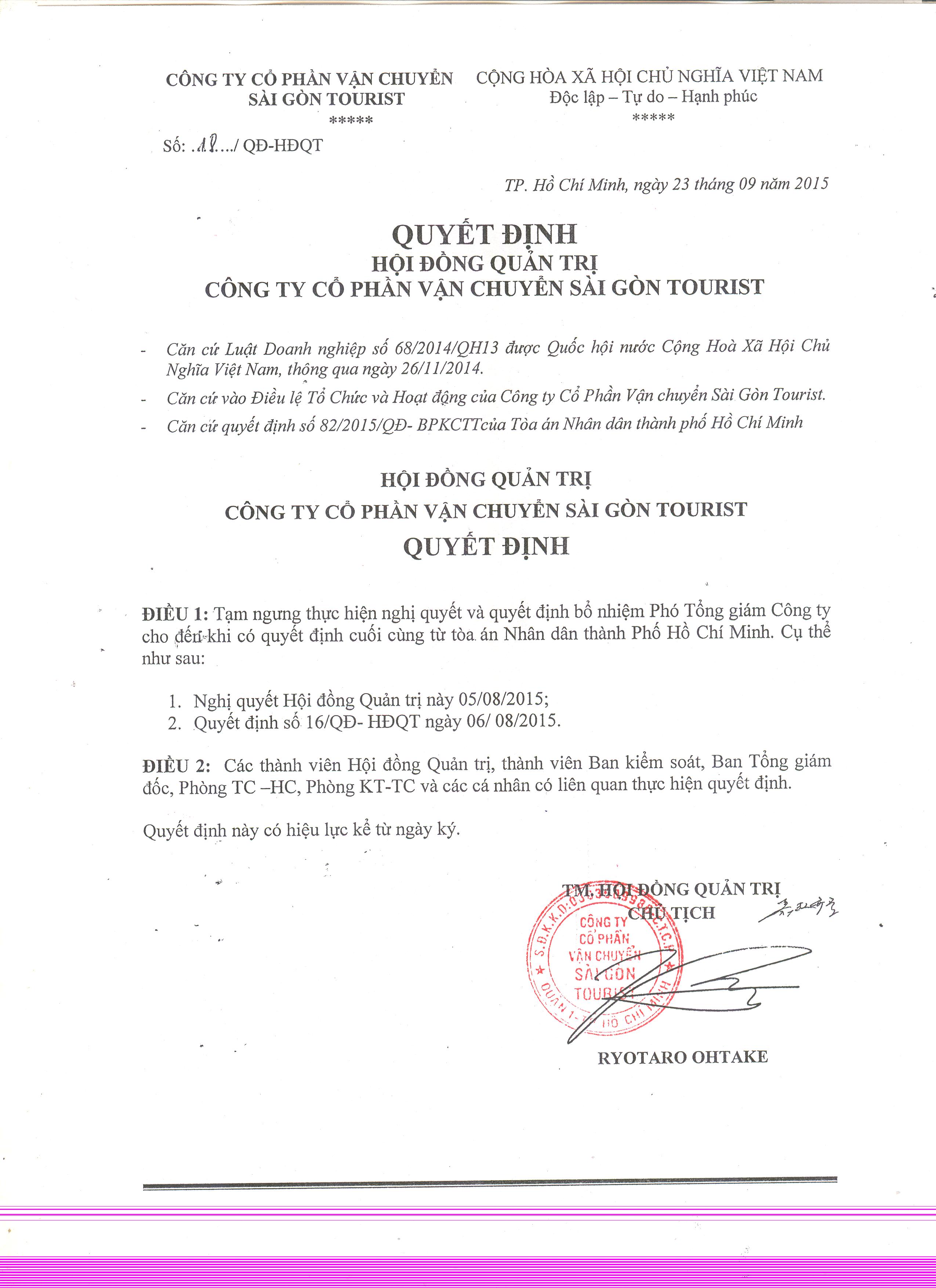 Quyết định tạm ngưng thực hiện nghị quyết 05 tháng 08 năm 2015 của Hội đồng quản trị công ty. Xem tại đây